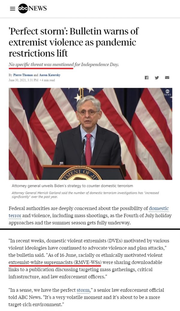 “Federal authorities are deeply concerned about the possibility of domestic terror and violence, including mass shootings, as the Fourth of July holiday approaches and the summer season gets fully underway,” ABC News said.